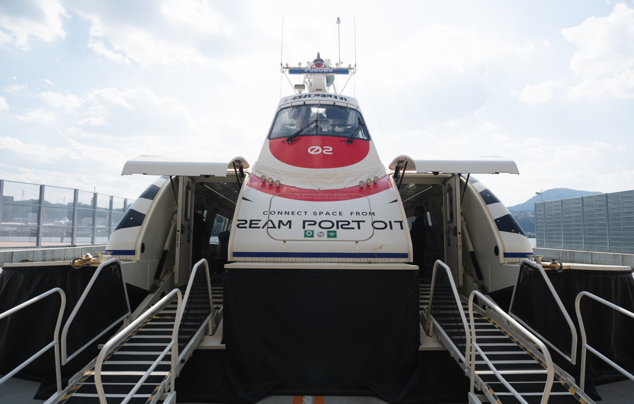 乗船10分前には、待合室からホーバーへ移動します。窓際席を確保するなら早めに並びましょう。オンラインチケットのQRコードを読み込んだら、いざ乗り場へ。間近で見るホーバーは想像よりも大きくて迫力満点です。
