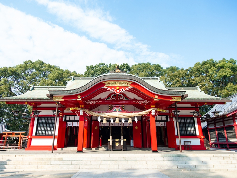 鮮やかな朱色と白のコントラスト美しい、平安時代から続く神社。約8000坪の広い境内には大楠をはじめ、緑があふれています。池には亀の泳ぐ姿も見られます。