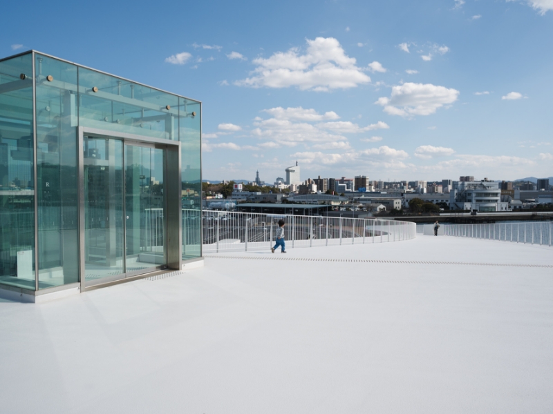 真っ白な床と青い海・空、ポストカードのような美しい景観が広がります。海風に吹かれながら、ホーバーやフェリー、大分や別府の町並をお楽しみください。