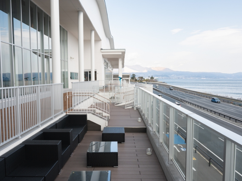 別府湾を一望できる、風の吹き抜けるバルコニー。右手には大分方面の工場の景色、左手には別府市街の町並みと、その後ろの雄大な山々を堪能できます。