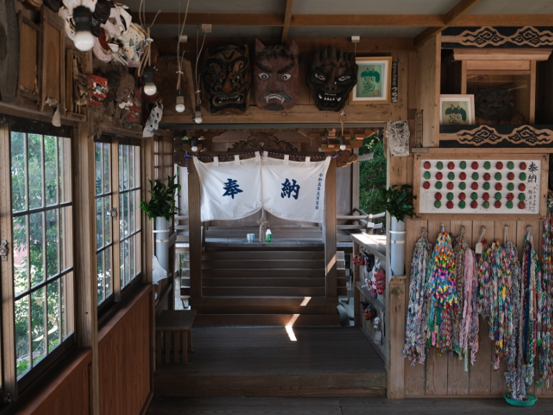小高い場所に佇むひっそりとした神社。境内には天満社と鬼神社が並び、拝殿には数多くの鬼面が見られます。すぐ側の急な山道を登った先は、石祠がある奥の院です。